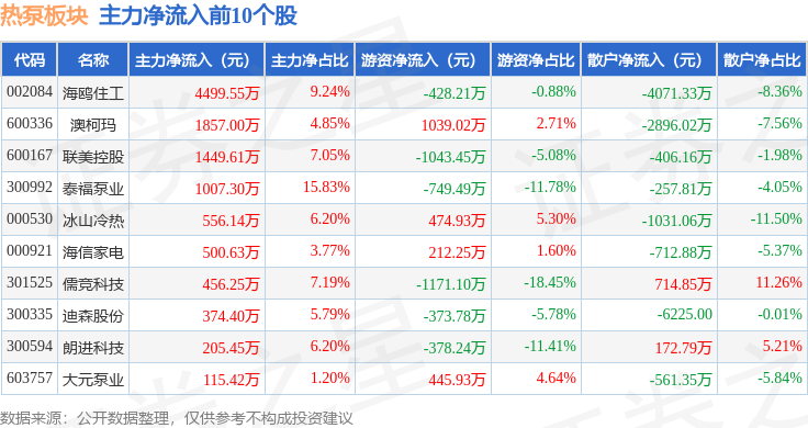 从资金流向上来看,当日热泵板块主力资金净流出1.5亿元,游资资金净流出9833.67万元,散户资金净流入2.48亿元。热泵板块个股资金流向见下表: