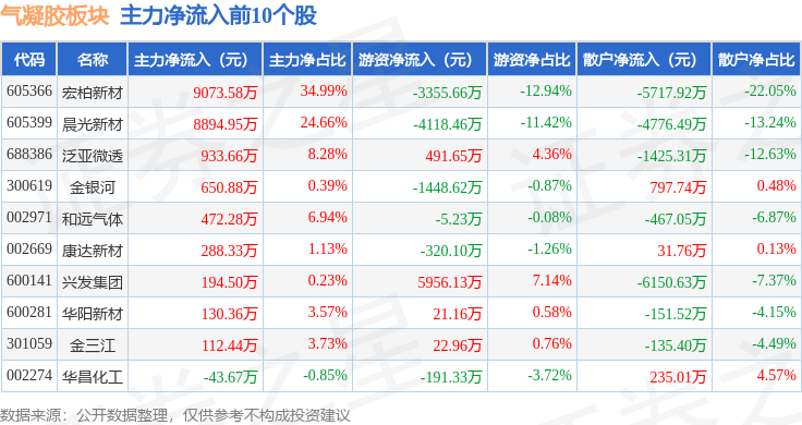 从资金流向上来看,当日气凝胶板块主力资金净流入5522.44万元,游资资金净流出3660.87万元,散户资金净流出1861.57万元。气凝胶板块个股资金流向见下表: