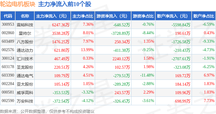 从资金流向上来看,当日轮边电机板块主力资金净流出6494.48万元,游资资金净流入1.39亿元,散户资金净流出7418.87万元。轮边电机板块个股资金流向见下表: