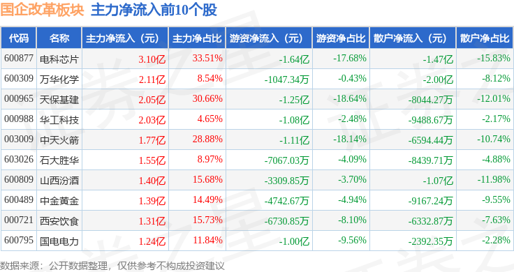 从资金流向上来看,当日国企改革板块主力资金净流出56.86亿元,游资资金净流入5.84亿元,散户资金净流入51.02亿元。国企改革板块个股资金流向见下表: