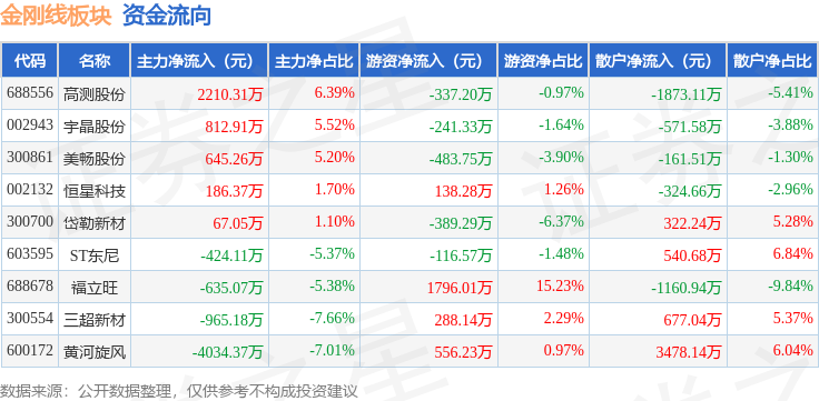 从资金流向上来看,当日金刚线板块主力资金净流出2136.83万元,游资资金净流入1210.52万元,散户资金净流入926.31万元。金刚线板块个股资金流向见下表: