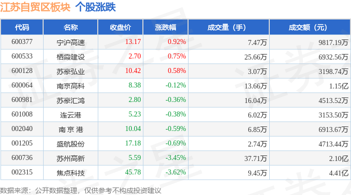 证券之星消息,11月27日江苏自贸区板块较上一交易日下跌0.19%,焦点科技领跌。当日上证指数报收于3875.26,上涨0.29%。深证成指报收于12875.19,下跌0.25%。江苏自贸区板块个股涨跌见下表: