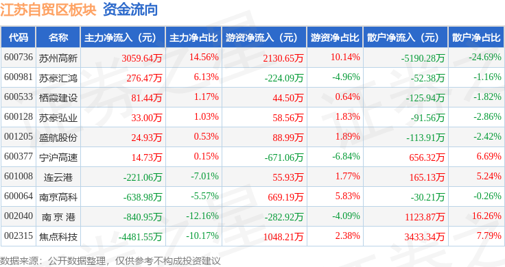 从资金流向上来看,当日江苏自贸区板块主力资金净流出2692.33万元,游资资金净流入2917.96万元,散户资金净流出225.63万元。江苏自贸区板块个股资金流向见下表:
