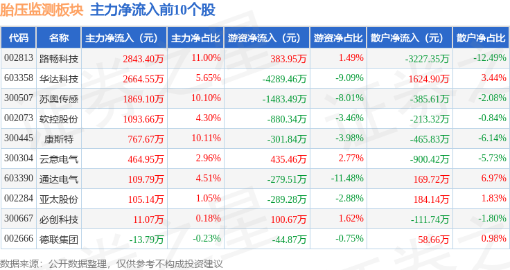 从资金流向上来看,当日胎压监测板块主力资金净流出1.44亿元,游资资金净流出1.21亿元,散户资金净流入2.65亿元。胎压监测板块个股资金流向见下表: