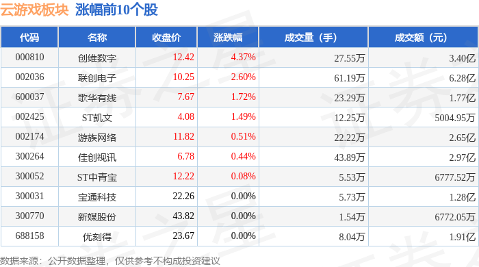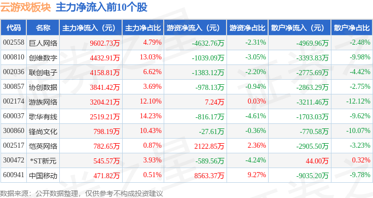 从资金流向上来看,当日云游戏板块主力资金净流出13.42亿元,游资资金净流入3.26亿元,散户资金净流入10.16亿元。云游戏板块个股资金流向见下表: