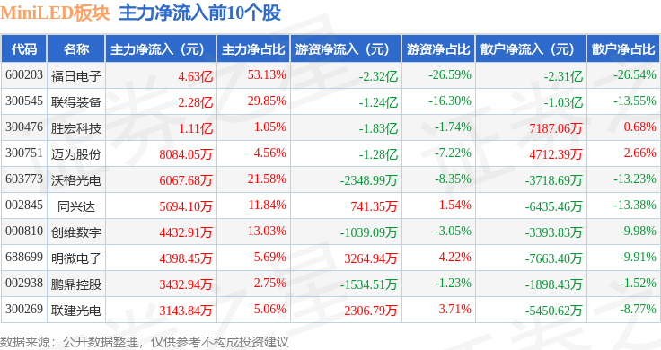 从资金流向上来看,当日MiniLED板块主力资金净流入5.04亿元,游资资金净流出3.67亿元,散户资金净流出1.37亿元。MiniLED板块个股资金流向见下表: