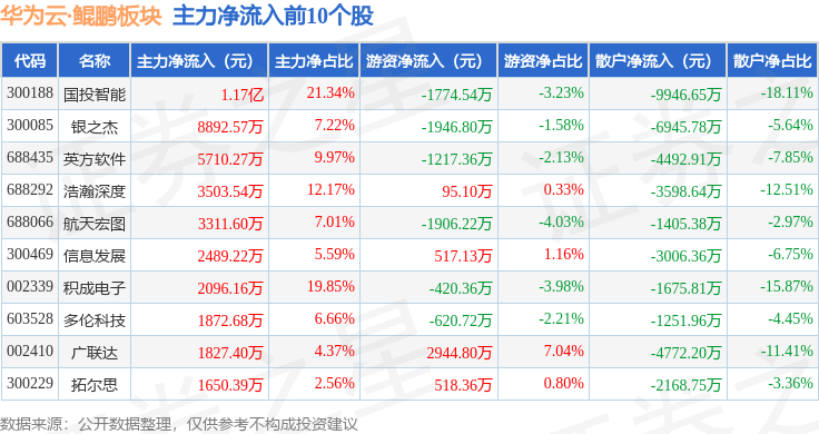 从资金流向上来看,当日华为云·鲲鹏板块主力资金净流出20.4亿元,游资资金净流出679.86万元,散户资金净流入20.47亿元。华为云·鲲鹏板块个股资金流向见下表: