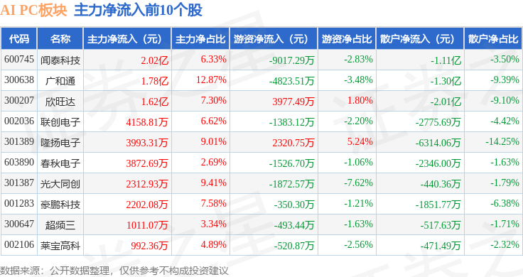 从资金流向上来看,当日AI PC板块主力资金净流入1.96亿元,游资资金净流出2.0亿元,散户资金净流入429.99万元。AI PC板块个股资金流向见下表: