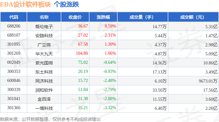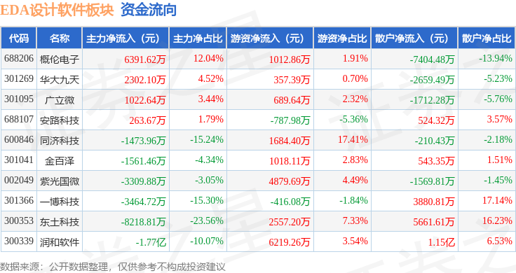 从资金流向上来看,当日EDA设计软件板块主力资金净流出2.57亿元,游资资金净流入1.72亿元,散户资金净流入8514.46万元。EDA设计软件板块个股资金流向见下表: