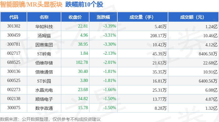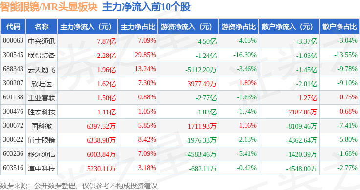 从资金流向上来看,当日智能眼镜/MR头显板块主力资金净流入8.34亿元,游资资金净流出14.08亿元,散户资金净流入5.74亿元。智能眼镜/MR头显板块个股资金流向见下表: