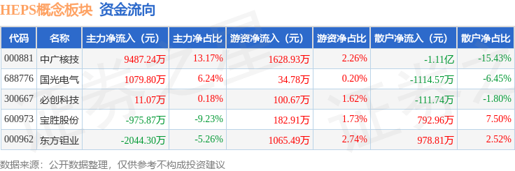 从资金流向上来看,当日HEPS概念板块主力资金净流入7557.94万元,游资资金净流入3012.77万元,散户资金净流出1.06亿元。HEPS概念板块个股资金流向见下表:
