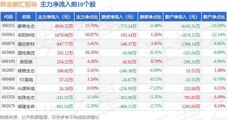 从资金流向上来看,当日林业碳汇板块主力资金净流入4912.77万元,游资资金净流入378.92万元,散户资金净流出5291.7万元。林业碳汇板块个股资金流向见下表: