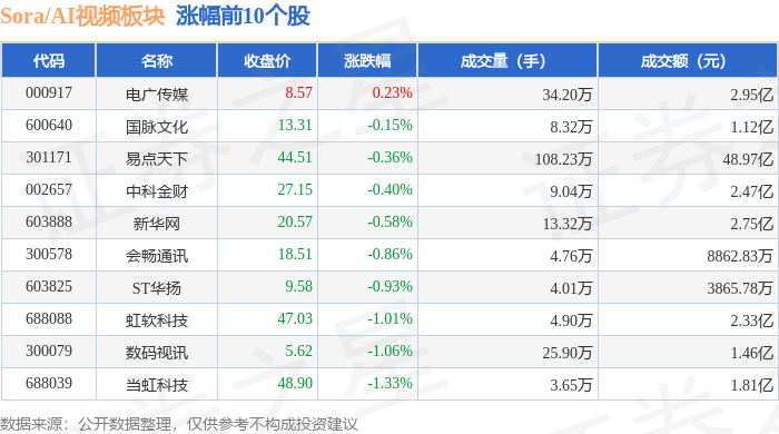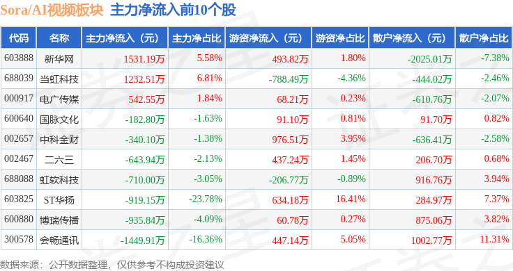 从资金流向上来看,当日Sora/AI视频板块主力资金净流出14.67亿元,游资资金净流入1.41亿元,散户资金净流入13.26亿元。Sora/AI视频板块个股资金流向见下表: