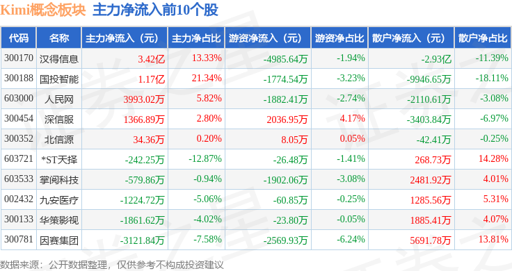 从资金流向上来看,当日Kimi概念板块主力资金净流出3.87亿元,游资资金净流入8311.74万元,散户资金净流入3.04亿元。Kimi概念板块个股资金流向见下表:
