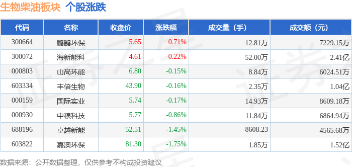 证券之星消息,11月27日生物柴油板块较上一交易日下跌0.56%,嘉澳环保领跌。当日上证指数报收于3875.26,上涨0.29%。深证成指报收于12875.19,下跌0.25%。生物柴油板块个股涨跌见下表: