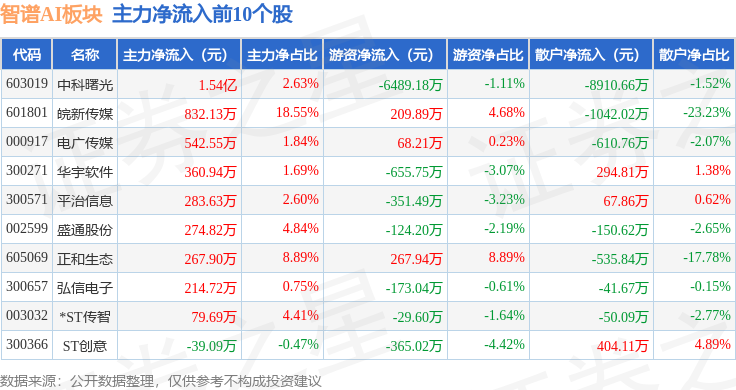 从资金流向上来看,当日智谱AI板块主力资金净流出14.01亿元,游资资金净流入5740.3万元,散户资金净流入13.43亿元。智谱AI板块个股资金流向见下表: