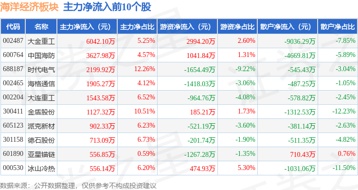 从资金流向上来看,当日海洋经济板块主力资金净流出6.51亿元,游资资金净流入6421.43万元,散户资金净流入5.87亿元。海洋经济板块个股资金流向见下表: