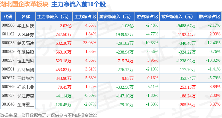 从资金流向上来看,当日湖北国企改革板块主力资金净流入2795.65万元,游资资金净流出7949.58万元,散户资金净流入5153.94万元。湖北国企改革板块个股资金流向见下表: