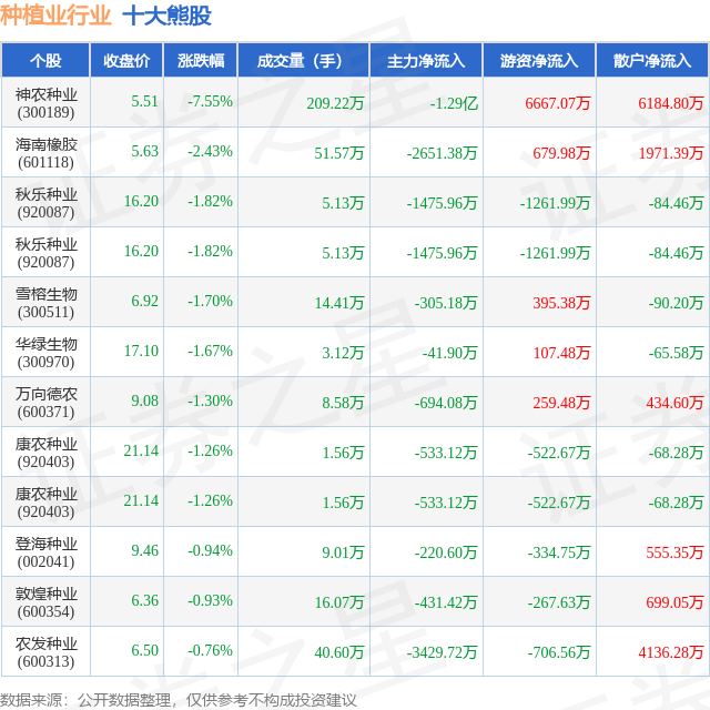 个股表现方面,种植业行业当日领跌股为神农种业(300189),该股当日报收5.51,下跌7.55%,成交量209.22万,主力资金净流出1.29亿元。海南橡胶(601118)以下跌2.43%紧随其后,该股当日成交量51.57万,主力资金净流出2651.38万元。除此之外,秋乐种业(920087)、秋乐种业(920087)、雪榕生物(300511)均进入当日熊股之列。具体个股列表见下表: