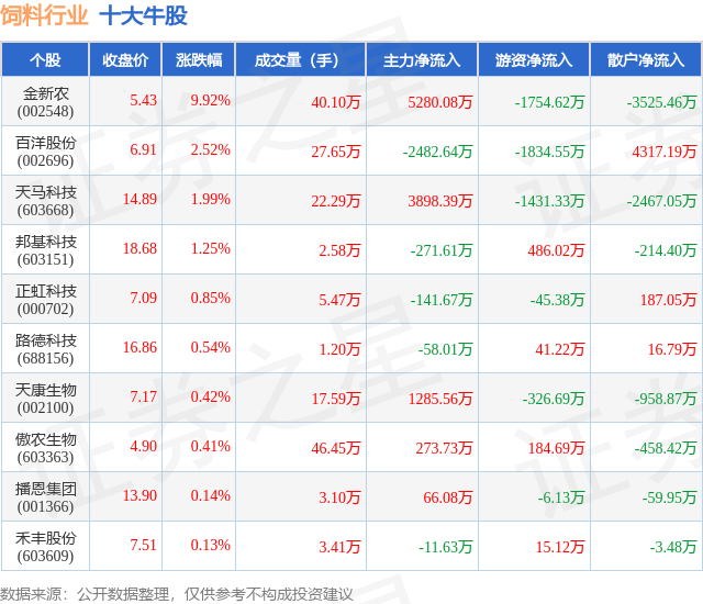 个股表现方面,饲料行业当日领涨股为金新农(002548),该股当日报收5.43,上涨9.92%,成交量40.1万,主力资金净流入5280.08万元。百洋股份(002696)以上涨2.52%紧随其后,该股当日成交量27.65万,主力资金净流出2482.64万元。除此之外,天马科技(603668)、邦基科技(603151)、正虹科技(000702)均进入当日牛股之列。具体个股列表见下表: