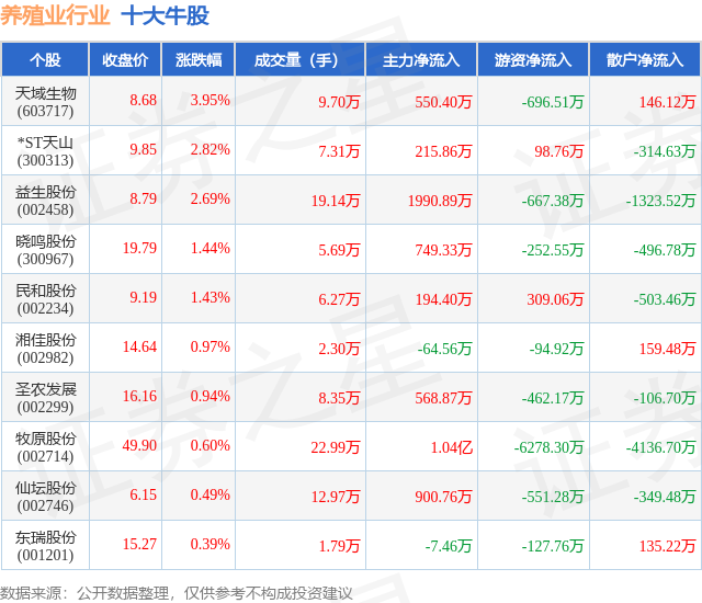 个股表现方面,养殖业行业当日领涨股为天域生物(603717),该股当日报收8.68,上涨3.95%,成交量9.7万,主力资金净流入550.4万元。*ST天山(300313)以上涨2.82%紧随其后,该股当日成交量7.31万,主力资金净流入215.86万元。除此之外,益生股份(002458)、晓鸣股份(300967)、民和股份(002234)均进入当日牛股之列。具体个股列表见下表:
