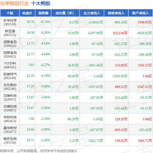 个股表现方面,化学制品行业当日领跌股为长华化学(301518),该股当日报收39.76,下跌8.74%,成交量8.27万,主力资金净流出1138.61万元。新亚强(603155)以下跌6.26%紧随其后,该股当日成交量33.03万,主力资金净流出6297.99万元。除此之外,润普食品(920422)、润普食品(920422)、*ST宁科(600165)均进入当日熊股之列。具体个股列表见下表: