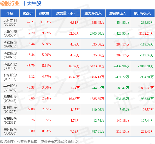 个股表现方面,橡胶行业当日领涨股为远翔新材(301300),该股当日报收47.21,上涨11.03%,成交量6.81万,主力资金净流入688.45万元。天铁科技(300587)以上涨9.22%紧随其后,该股当日成交量62.06万,主力资金净流出2705.3万元。除此之外,科强股份(920665)、科强股份(920665)、科创新源(300731)均进入当日牛股之列。具体个股列表见下表: