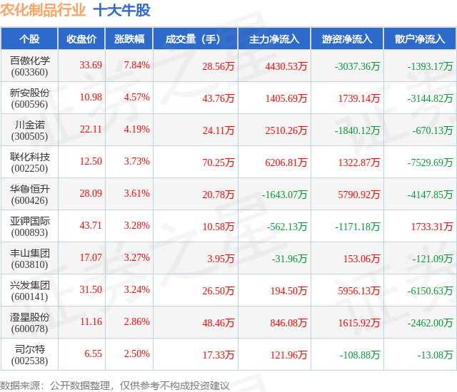 个股表现方面,农化制品行业当日领涨股为百傲化学(603360),该股当日报收33.69,上涨7.84%,成交量28.56万,主力资金净流入4430.53万元。新安股份(600596)以上涨4.57%紧随其后,该股当日成交量43.76万,主力资金净流入1405.69万元。除此之外,川金诺(300505)、联化科技(002250)、华鲁恒升(600426)均进入当日牛股之列。具体个股列表见下表: