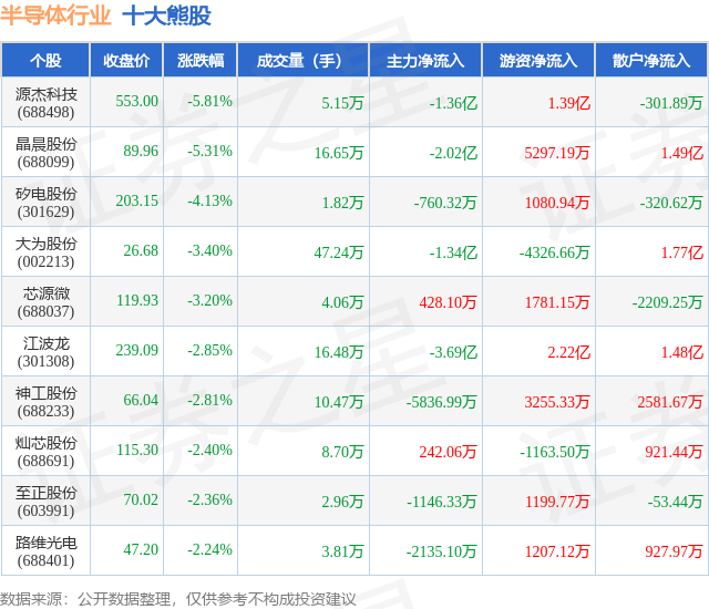 个股表现方面,半导体行业当日领跌股为源杰科技(688498),该股当日报收553.0,下跌5.81%,成交量5.15万,主力资金净流出1.36亿元。晶晨股份(688099)以下跌5.31%紧随其后,该股当日成交量16.65万,主力资金净流出2.02亿元。除此之外,矽电股份(301629)、大为股份(002213)、芯源微(688037)均进入当日熊股之列。具体个股列表见下表: