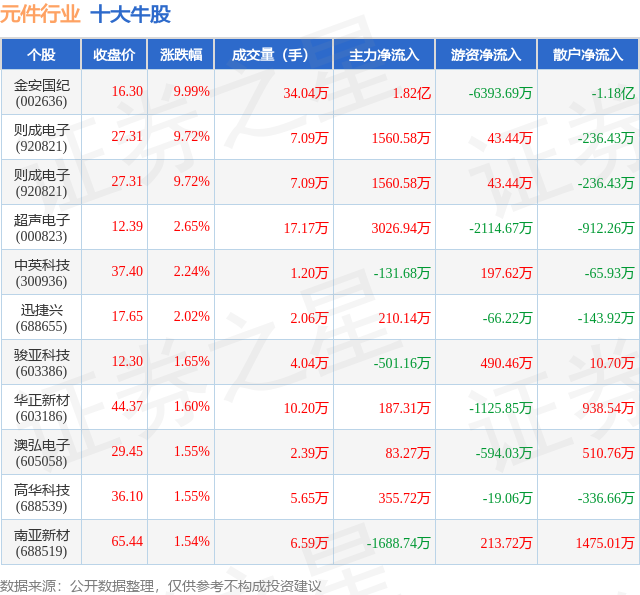 个股表现方面,元件行业当日领涨股为金安国纪(002636),该股当日报收16.3,上涨9.99%,成交量34.04万,主力资金净流入1.82亿元。则成电子(920821)以上涨9.72%紧随其后,该股当日成交量7.09万,主力资金净流入1560.58万元。除此之外,则成电子(920821)、超声电子(000823)、中英科技(300936)均进入当日牛股之列。具体个股列表见下表: