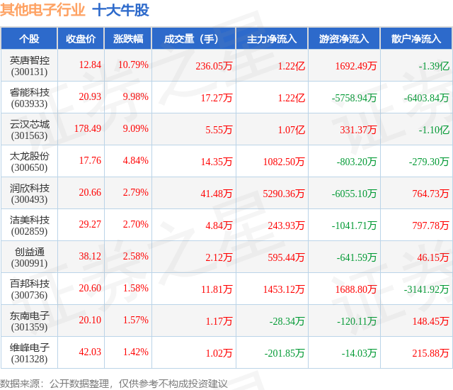 个股表现方面,其他电子行业当日领涨股为英唐智控(300131),该股当日报收12.84,上涨10.79%,成交量236.05万,主力资金净流入1.22亿元。睿能科技(603933)以上涨9.98%紧随其后,该股当日成交量17.27万,主力资金净流入1.22亿元。除此之外,云汉芯城(301563)、太龙股份(300650)、润欣科技(300493)均进入当日牛股之列。具体个股列表见下表: