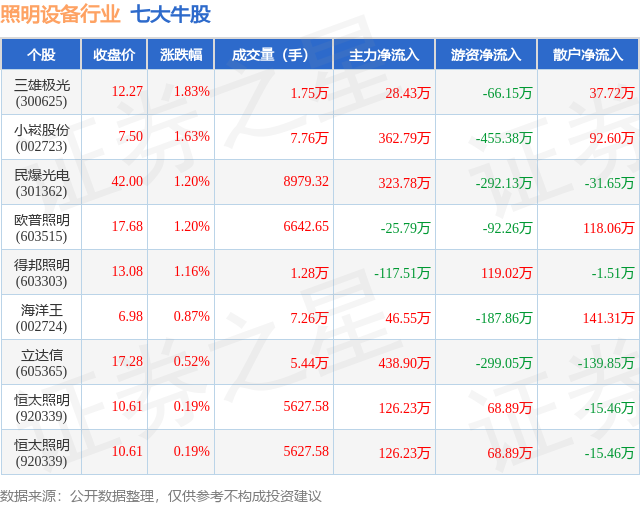 个股表现方面,照明设备行业当日领涨股为三雄极光(300625),该股当日报收12.27,上涨1.83%,成交量1.75万,主力资金净流入28.43万元。小崧股份(002723)以上涨1.63%紧随其后,该股当日成交量7.76万,主力资金净流入362.79万元。除此之外,民爆光电(301362)、欧普照明(603515)、得邦照明(603303)均进入当日牛股之列。具体个股列表见下表: