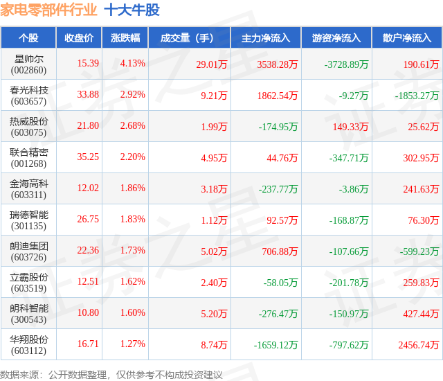个股表现方面,家电零部件行业当日领涨股为星帅尔(002860),该股当日报收15.39,上涨4.13%,成交量29.01万,主力资金净流入3538.28万元。春光科技(603657)以上涨2.92%紧随其后,该股当日成交量9.21万,主力资金净流入1862.54万元。除此之外,热威股份(603075)、联合精密(001268)、金海高科(603311)均进入当日牛股之列。具体个股列表见下表: