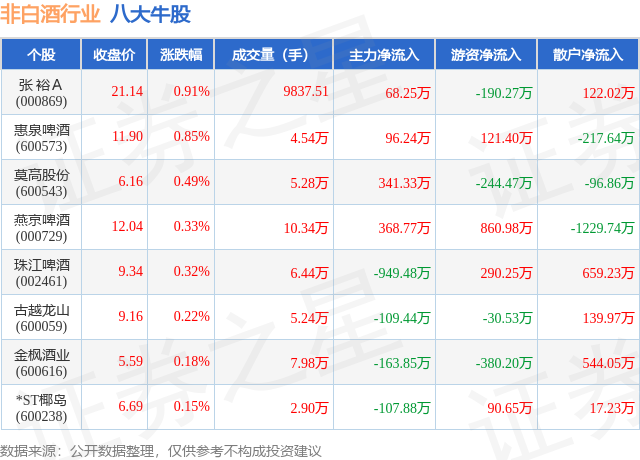个股表现方面,非白酒行业当日领涨股为张 裕A(000869),该股当日报收21.14,上涨0.91%,成交量9838.0,主力资金净流入68.25万元。惠泉啤酒(600573)以上涨0.85%紧随其后,该股当日成交量4.54万,主力资金净流入96.24万元。除此之外,莫高股份(600543)、燕京啤酒(000729)、珠江啤酒(002461)均进入当日牛股之列。具体个股列表见下表: