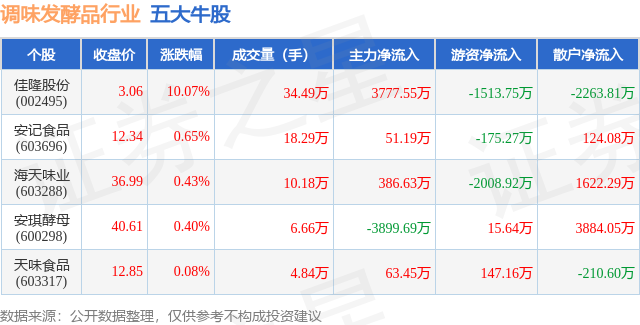 个股表现方面,调味发酵品行业当日领涨股为佳隆股份(002495),该股当日报收3.06,上涨10.07%,成交量34.49万,主力资金净流入3777.55万元。安记食品(603696)以上涨0.65%紧随其后,该股当日成交量18.29万,主力资金净流入51.19万元。除此之外,海天味业(603288)、安琪酵母(600298)、天味食品(603317)均进入当日牛股之列。具体个股列表见下表: