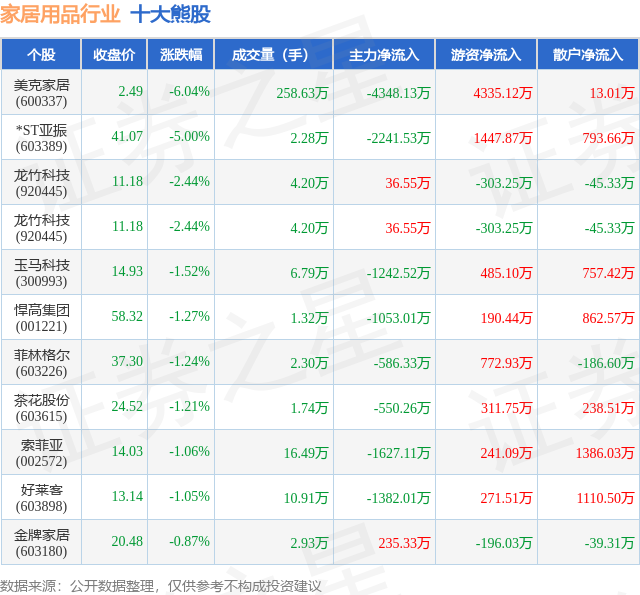 个股表现方面,家居用品行业当日领跌股为美克家居(600337),该股当日报收2.49,下跌6.04%,成交量258.63万,主力资金净流出4348.13万元。*ST亚振(603389)以下跌5.0%紧随其后,该股当日成交量2.28万,主力资金净流出2241.53万元。除此之外,龙竹科技(920445)、龙竹科技(920445)、玉马科技(300993)均进入当日熊股之列。具体个股列表见下表: