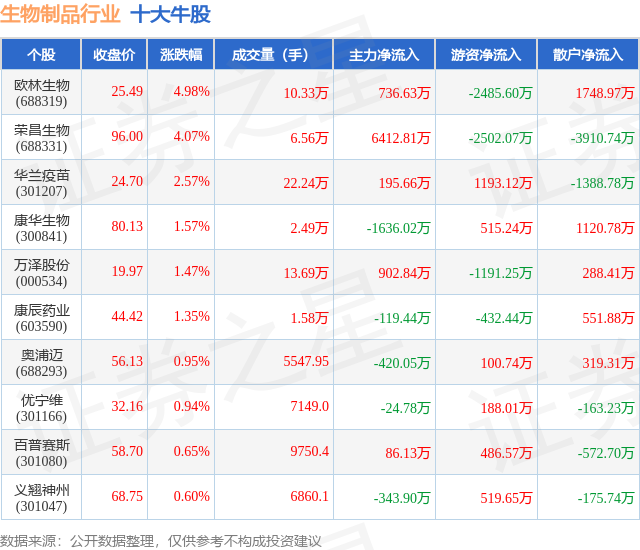个股表现方面,生物制品行业当日领涨股为欧林生物(688319),该股当日报收25.49,上涨4.98%,成交量10.33万,主力资金净流入736.63万元。荣昌生物(688331)以上涨4.07%紧随其后,该股当日成交量6.56万,主力资金净流入6412.81万元。除此之外,华兰疫苗(301207)、康华生物(300841)、万泽股份(000534)均进入当日牛股之列。具体个股列表见下表:
