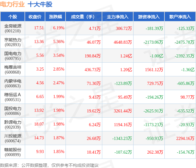 个股表现方面,电力行业当日领涨股为金房能源(001210),该股当日报收17.51,上涨6.19%,成交量4.71万,主力资金净流入306.72万元。京能热力(002893)以上涨5.36%紧随其后,该股当日成交量46.07万,主力资金净流入4648.83万元。除此之外,国电电力(600795)、梅雁吉祥(600868)、内蒙华电(600863)均进入当日牛股之列。具体个股列表见下表: