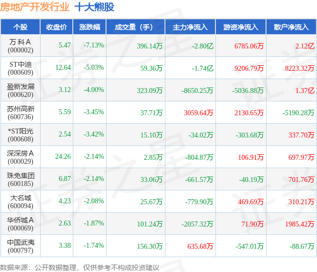 个股表现方面,房地产开发行业当日领跌股为万 科A(000002),该股当日报收5.47,下跌7.13%,成交量396.14万,主力资金净流出2.8亿元。ST中迪(000609)以下跌5.03%紧随其后,该股当日成交量59.36万,主力资金净流出1.74亿元。除此之外,盈新发展(000620)、苏州高新(600736)、*ST阳光(000608)均进入当日熊股之列。具体个股列表见下表: