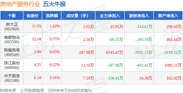 个股表现方面,房地产服务行业当日领涨股为新大正(002968),该股当日报收11.93,上涨1.02%,成交量2.65万,主力资金净流入15.95万元。南都物业(603506)以上涨0.75%紧随其后,该股当日成交量2.58万,主力资金净流出69.25万元。除此之外,我爱我家(000560)、珠江股份(600684)、中天服务(002188)均进入当日牛股之列。具体个股列表见下表: