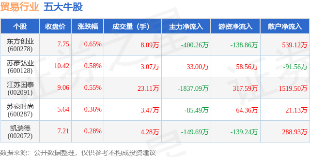 个股表现方面,贸易行业当日领涨股为东方创业(600278),该股当日报收7.75,上涨0.65%,成交量8.09万,主力资金净流出400.26万元。苏豪弘业(600128)以上涨0.58%紧随其后,该股当日成交量3.07万,主力资金净流入33.0万元。除此之外,江苏国泰(002091)、苏豪时尚(600287)、凯瑞德(002072)均进入当日牛股之列。具体个股列表见下表: