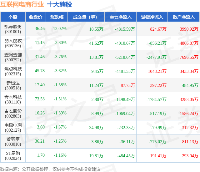 个股表现方面,互联网电商行业当日领跌股为凯淳股份(301001),该股当日报收36.46,下跌12.02%,成交量18.55万,主力资金净流出4815.59万元。丽人丽妆(605136)以下跌3.8%紧随其后,该股当日成交量41.62万,主力资金净流出4010.67万元。除此之外,壹网壹创(300792)、焦点科技(002315)、新迅达(300518)均进入当日熊股之列。具体个股列表见下表: