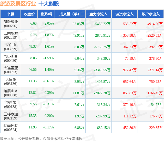 个股表现方面,旅游及景区行业当日领跌股为凯撒旅业(000796),该股当日报收6.68,下跌2.05%,成交量93.85万,主力资金净流出5450.72万元。云南旅游(002059)以下跌1.87%紧随其后,该股当日成交量49.91万,主力资金净流出2873.91万元。除此之外,长白山(603099)、*ST张股(000430)、大连圣亚(600593)均进入当日熊股之列。具体个股列表见下表:
