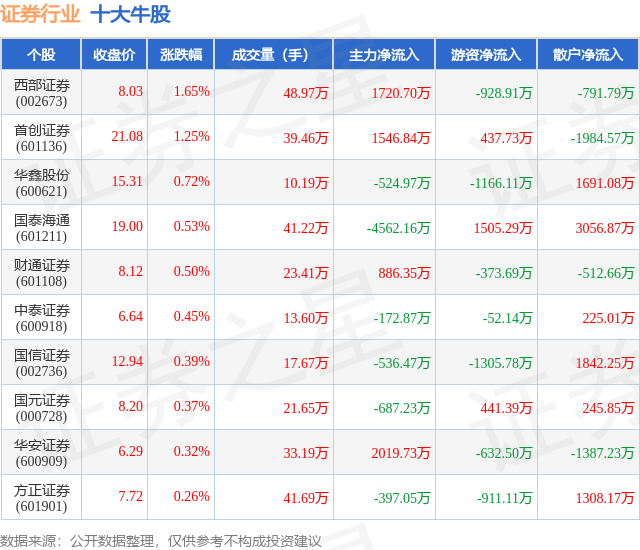 个股表现方面,证券行业当日领涨股为西部证券(002673),该股当日报收8.03,上涨1.65%,成交量48.97万,主力资金净流入1720.7万元。首创证券(601136)以上涨1.25%紧随其后,该股当日成交量39.46万,主力资金净流入1546.84万元。除此之外,华鑫股份(600621)、国泰海通(601211)、财通证券(601108)均进入当日牛股之列。具体个股列表见下表: