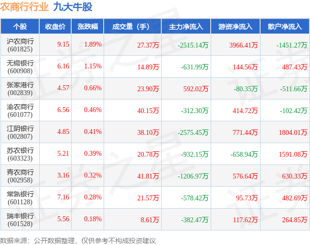 个股表现方面,农商行行业当日领涨股为沪农商行(601825),该股当日报收9.15,上涨1.89%,成交量27.37万,主力资金净流出2515.14万元。无锡银行(600908)以上涨1.15%紧随其后,该股当日成交量14.89万,主力资金净流出631.99万元。除此之外,张家港行(002839)、渝农商行(601077)、江阴银行(002807)均进入当日牛股之列。具体个股列表见下表: