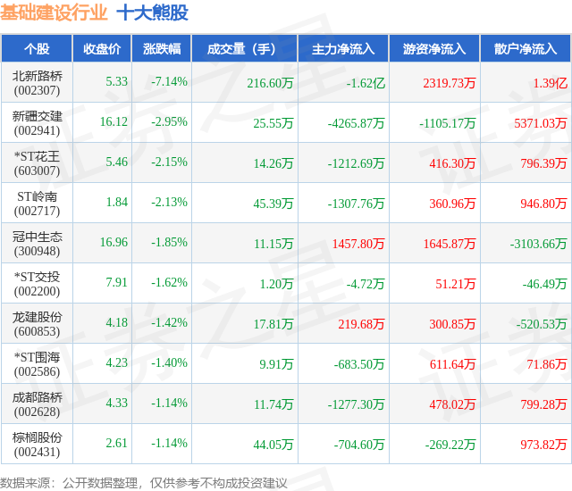 个股表现方面,基础建设行业当日领跌股为北新路桥(002307),该股当日报收5.33,下跌7.14%,成交量216.6万,主力资金净流出1.62亿元。新疆交建(002941)以下跌2.95%紧随其后,该股当日成交量25.55万,主力资金净流出4265.87万元。除此之外,*ST花王(603007)、ST岭南(002717)、冠中生态(300948)均进入当日熊股之列。具体个股列表见下表: