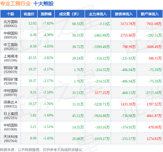 个股表现方面,专业工程行业当日领跌股为北方国际(000065),该股当日报收12.02,下跌7.82%,成交量68.33万,主力资金净流出1.11亿元。中钢国际(000928)以下跌4.36%紧随其后,该股当日成交量58.33万,主力资金净流出2462.89万元。除此之外,中工国际(002051)、上海港湾(605598)、铜冠矿建(920019)均进入当日熊股之列。具体个股列表见下表: