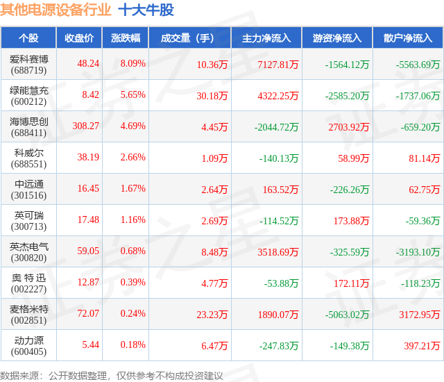 个股表现方面,其他电源设备行业当日领涨股为爱科赛博(688719),该股当日报收48.24,上涨8.09%,成交量10.36万,主力资金净流入7127.81万元。绿能慧充(600212)以上涨5.65%紧随其后,该股当日成交量30.18万,主力资金净流入4322.25万元。除此之外,海博思创(688411)、科威尔(688551)、中远通(301516)均进入当日牛股之列。具体个股列表见下表: