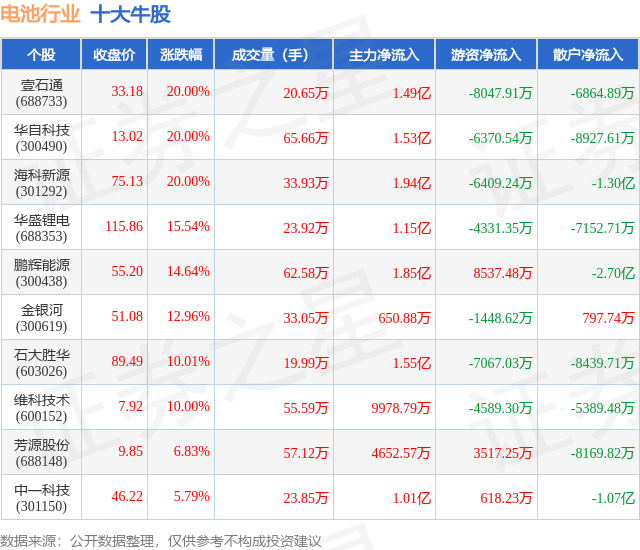 个股表现方面,电池行业当日领涨股为壹石通(688733),该股当日报收33.18,上涨20.0%,成交量20.65万,主力资金净流入1.49亿元。华自科技(300490)以上涨20.0%紧随其后,该股当日成交量65.66万,主力资金净流入1.53亿元。除此之外,海科新源(301292)、华盛锂电(688353)、鹏辉能源(300438)均进入当日牛股之列。具体个股列表见下表: