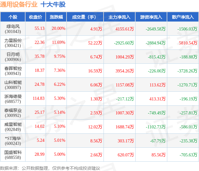 个股表现方面,通用设备行业当日领涨股为绿岛风(301043),该股当日报收55.13,上涨20.0%,成交量4.91万,主力资金净流入4155.61万元。力星股份(300421)以上涨11.69%紧随其后,该股当日成交量52.22万,主力资金净流出2925.6万元。除此之外,日月明(300906)、春晖智控(300943)、山科智能(300897)均进入当日牛股之列。具体个股列表见下表: